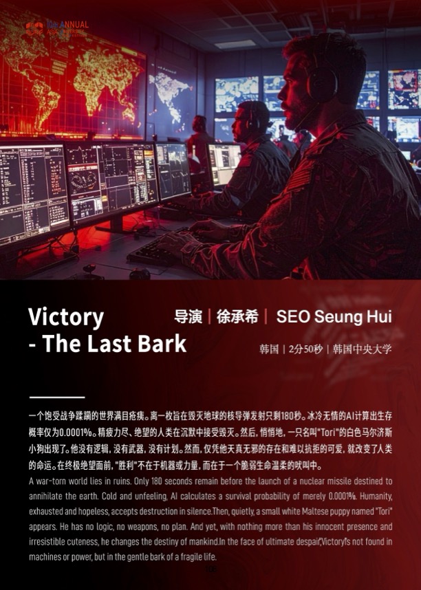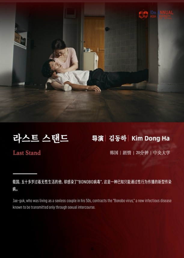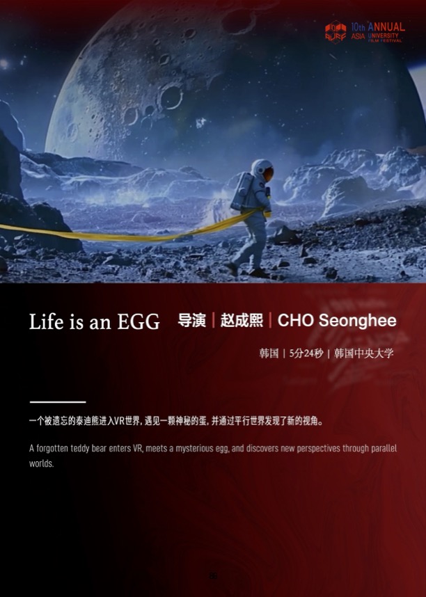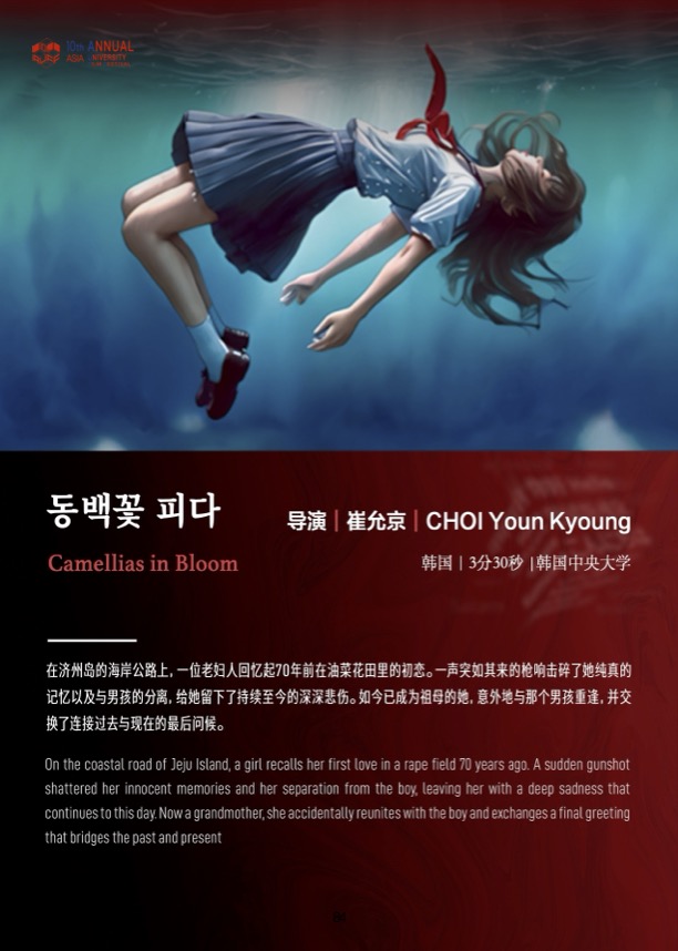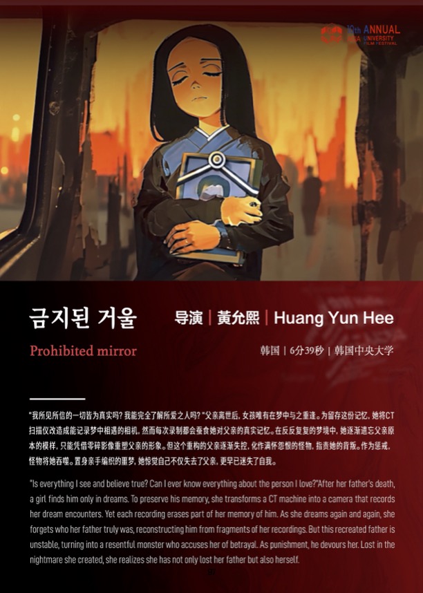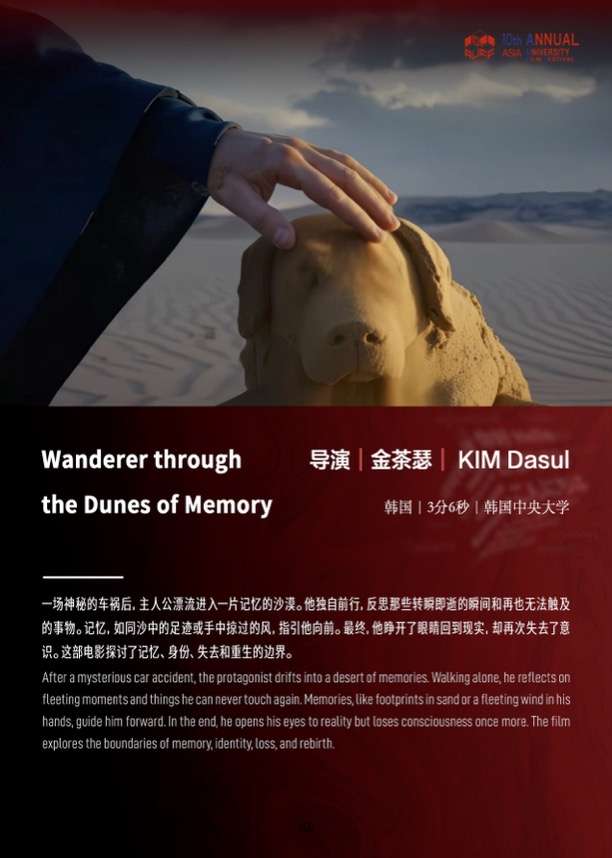 2025 아시아대학생영화제 2025년 11월 21일부터 11월24일까지 중국 베이징에서 개최된 제10회 아시아대학생영화제 단편 극영화(Main Competition)·AI영화(AIGC Competition) 부문 최종상영작에 첨단영상대학원 소속 김다슬, 김동하, 김정수, 문혜준, 서승희, 오은영, 조성희, 최윤경, 황윤희 학생의 작품이 선정되었습니다. 특히 올해는 영화영상제작, 예술공학, OTT·콘텐츠기획/정책/비즈니스등 다양한 전공 학생들의 실사영화 및 AI영화가 상영되었습니다. 행사명: 제10회 아시아대학생 영화제 THE 10th ANNUAL ASIA UNIVERSITY FILM FESTIVAL 주최(Organizer): School of Theatre, Film and Television, CUC . ![]() <Wanderer through the Dunes of Memory> 감독: 김다슬 . ![]() <라스트 스탠드 Last Stand> 감독: 김동하 촬영: 장명공 . ![]() <The unlearnable> 감독: 김정수 .